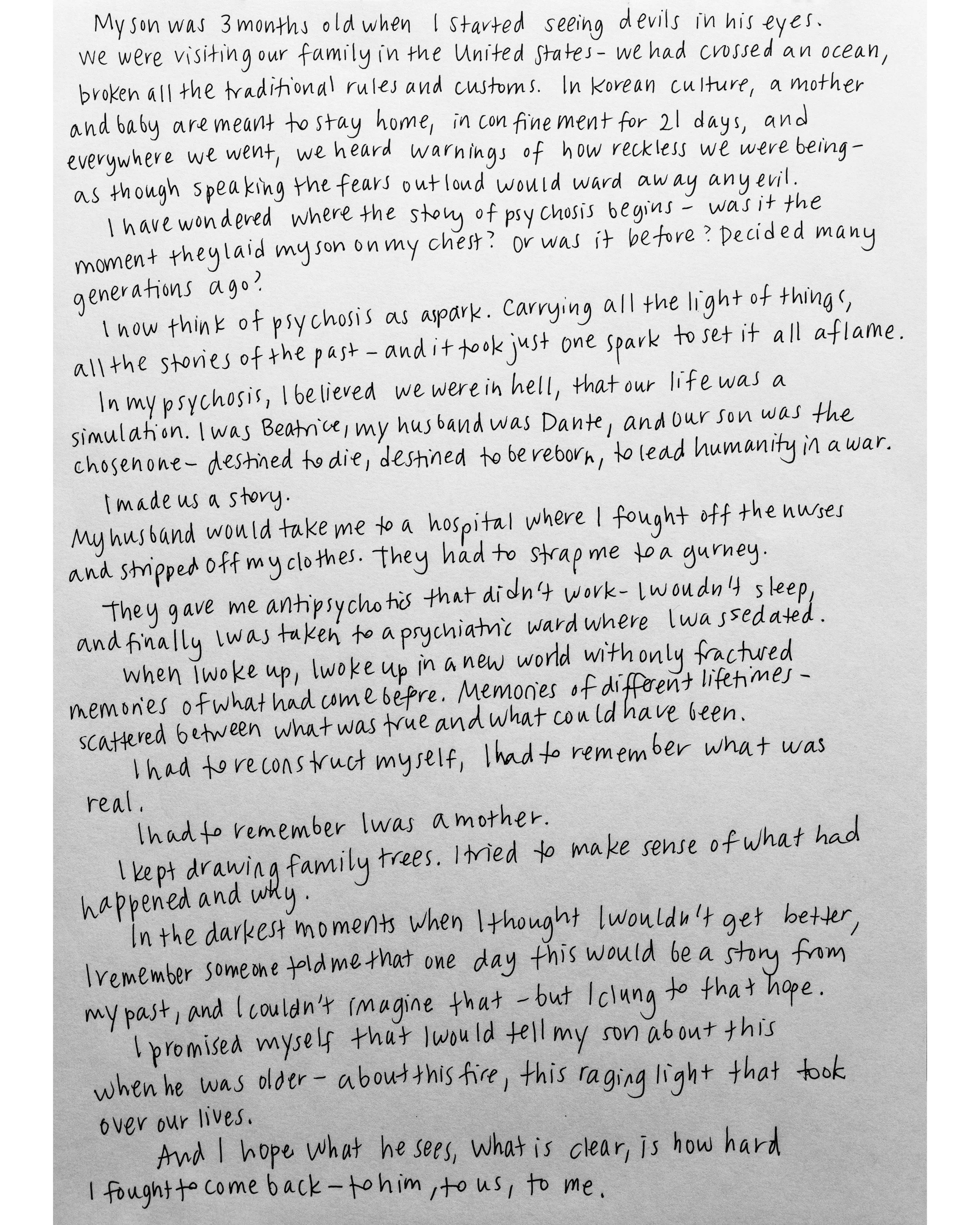 Catherine – A Story of postpartum psychosis. “I now think of psychosis as a spark – Carrying the light of all things, all the stories of the past – and it took just one spark to set it aflame.”